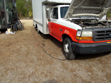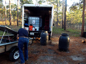 Using the truck battery to pump water into buffalos.